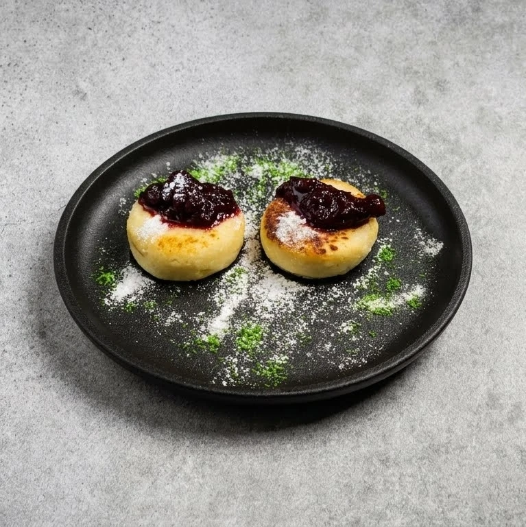 Нежные сырники с лёгкой творожной текстурой и приятной сладостью. Украшены чёрной смородиной и вишней, которые добавляют яркую кислинку. Посыпаны сахарной пудрой и дополнены крошкой безе.